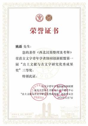 12月7日,“古文字青年学者协同创新联盟”第一届“出土文献与古文字研究优秀成果奖”颁奖典礼在复旦大学举行,万象城官网姚磊老师的著作《西北汉简整理及考释》荣获三等奖。