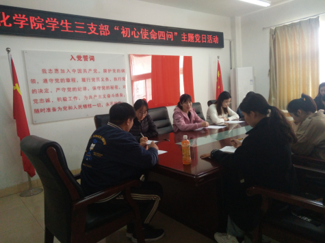 会上,党支部书记吴慧娟首先传达了上级党组织关于“初心使命四问”的精神与要求。学生三支部围绕“守初心、担使命、找差距、抓落实”的总要求,结合“入党初心是什么、党员使命担什么、对照先进查什么、立足本职做什么”的问题,认真分析查找自身存在的典型问题。