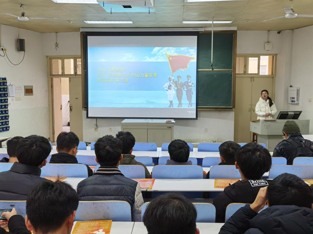 付亚男首先从中国百年历史出发,分析国内外局势,强调参军对国家和个人的意义,鼓励广大有志青年极响应祖国召唤踊跃报名参军。随后她详细讲解了大学生参军的优抚政策,解答了同学们的问题。最后,通过图片演示了入伍报名的渠道和步骤,以及体检的基本要求和注意事项。