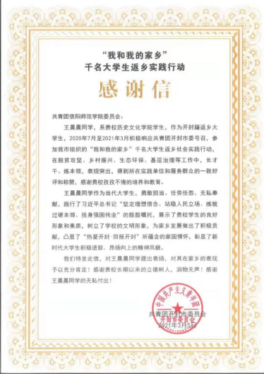 信中写道,王晨晨同学在家乡脱贫攻坚、乡村振兴、生态环保、基层治理等工作中,认真严谨、脚踏实地,努力长才干、练本领,得到了所在实践单位和服务群众的一致好评与称赞。王晨晨同学作为当代大学生,勇敢担当、任劳任怨、无私奉献,践行了习近平总书记“坚定理想信念、站稳人民立场、练就过硬本领、投身强国伟业”的殷殷嘱托,展现了大学生的良好形象与素质,树立了学校的文明形象,为家乡的发展做出了积极的贡献,凸显了“热爱开封”所蕴含的家国情怀,彰显了新时代大学生积极进取、昂扬向上的精神风貌。