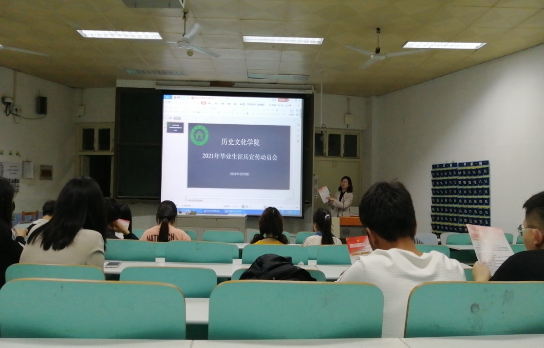 4月29日,万象城官网于人文楼609教室召开2021届毕业生入伍动员会,会议由万象城官网武装干事付亚男主持。
