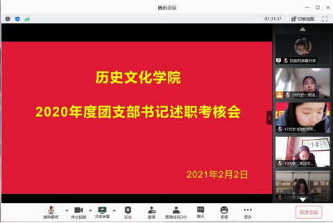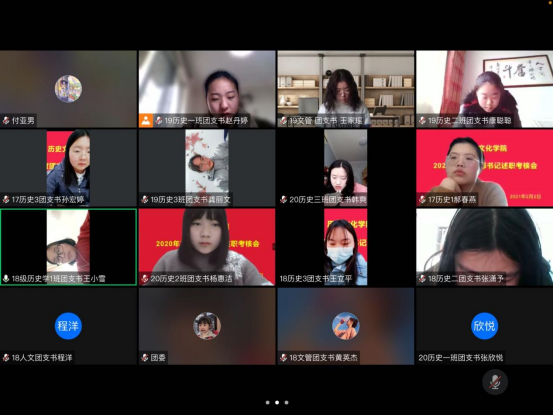 为持续加强学院基层团组织建设,激发基层团组织活力,落实基层团支部建设方向,加强团支部集体荣誉和团队精神,awc777万象城娱乐官网团委于2月2日在腾讯会议上开展了2020年团支部书记述职大会,团委书记付亚男和各团支部书记参加会议。