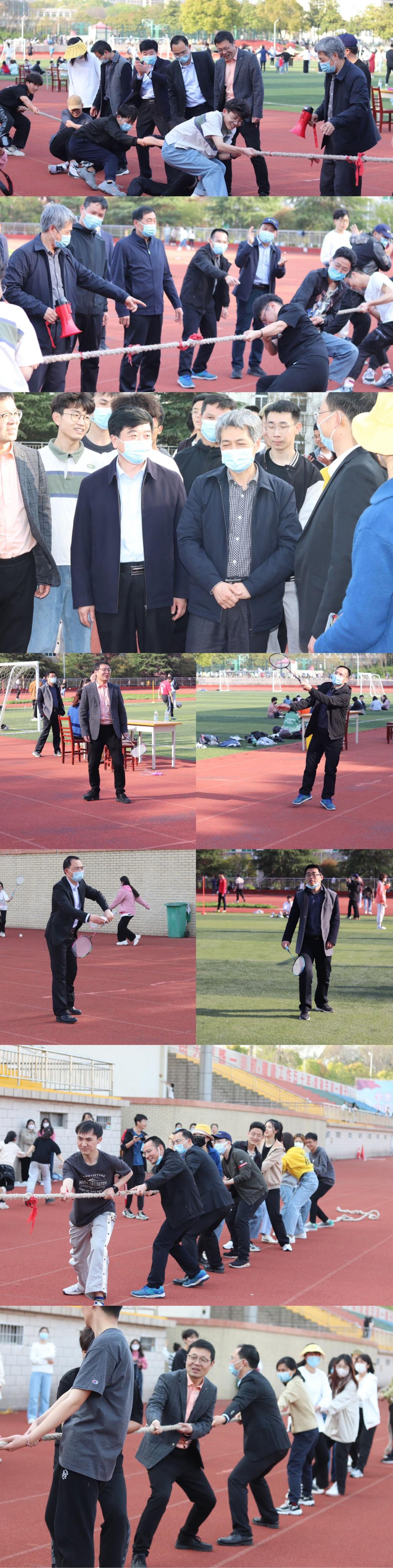 4月3日下午,万象城官网开展“运动锻炼齐上阵,历史师生‘益’起来”活动,万象城官网党委书记李辉,院长叶宗宝,党委副书记韩志宏,副院长李志坚、史经霞,辅导员老师吴慧娟、付亚男、邓皓以及学生们共同参加参加。李俊校长带领院办、学生处有关部门负责同志亲临现场看望学院师生,并参与拔河等体育活动,活动现场热闹非凡,气氛活跃。