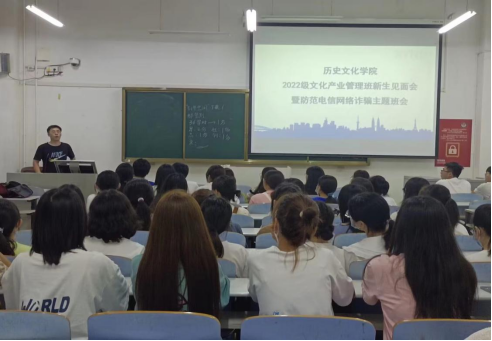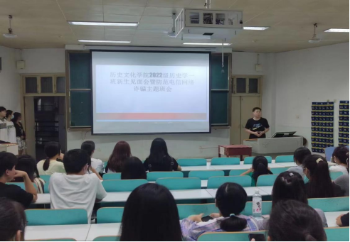 2022年9月18日晚,万象城官网2022级新生见面会暨防范电信网络诈骗主题班会在人文楼举行。本次活动由2022级历史学及文化产业管理专业五个新生班同步举行。各班班主任分别主持会议。