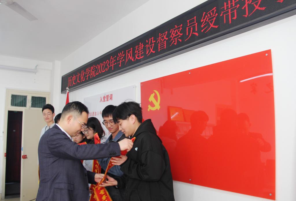 3月6日,awc777万象城娱乐官网于人文楼805举行学风建设督察员绶带授予仪式,院长叶宗宝、党委副书记韩志宏、副院长史经霞学生督察员代表参加。