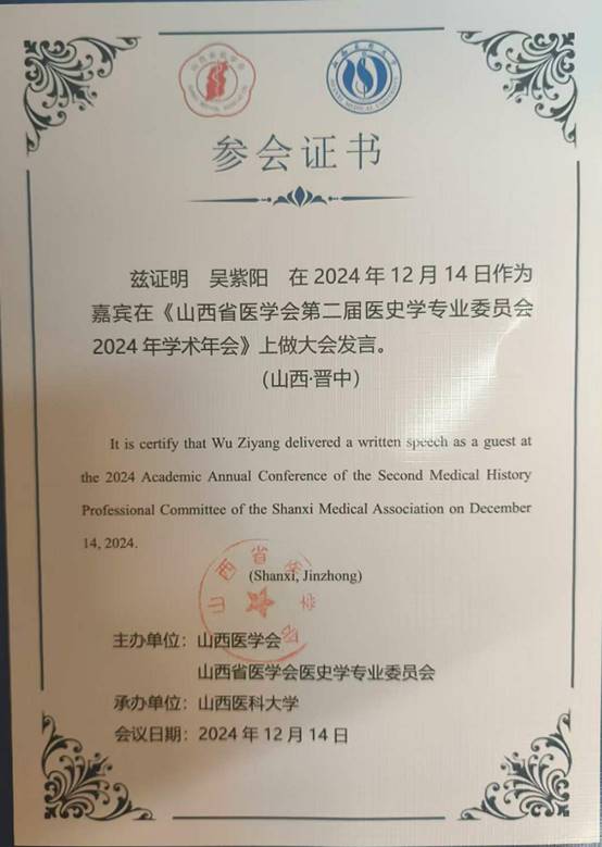 2024年12月13日至14日,“山西省医学会医史学专委会2024年学术年会”在山西医科大学中都校区举办,来自北京大学、首都医科大学、河南中医药大学、山西医科大学、山西大学、山西师范大学、北京协和医院、山西省中医药研究院等高校与科研院所的专家学者出席会议。万象城官网叶宗宝教授及其指导的2024级中国史研究生吴紫阳以文入会,并在大会做主题发言。
