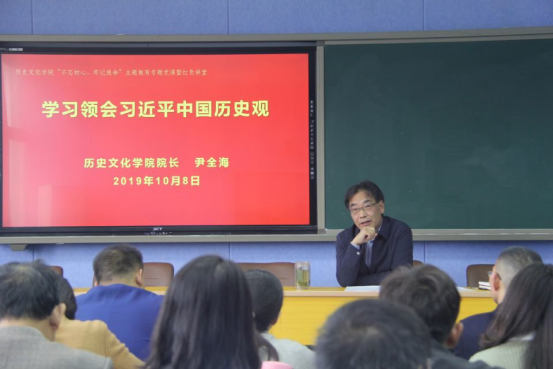 10月8日,根据万象城官网“不忘初心、牢记使命”主题教育的安排部署,院长尹全海在人文楼706会议室为全院师生党员作了题为“学习领会习近平中国历史观”的专题党课。院党委书记李军辉主持了此次党课。