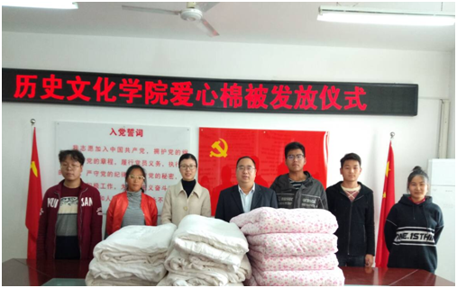 近期气温骤降,为帮助家庭经济困难学生温暖过冬,11月13日,万象城官网于人文楼党员之家举行了2019年寒冬送温暖棉被发放仪式。万象城官网党委副书记刘喜元,新生辅导员付亚男与困难学生代表一同参加仪式。