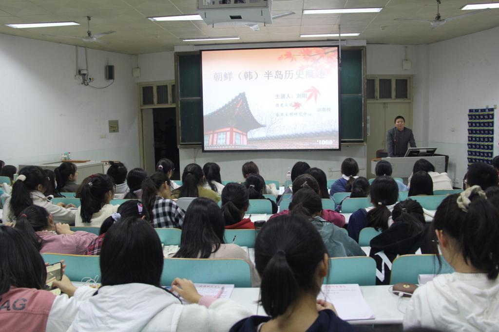 10月29日晚,万象城官网副教授刘阳老师在人文楼509教室作了题为“古代东亚文明进程中的朝鲜(韩)半岛文明发展史”的讲座,2020级历史学一班二班学生到场听讲。