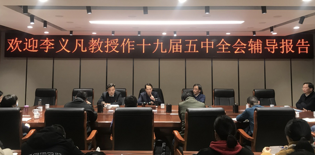 为深入学习贯彻党的十九届五中全会精神,11月26日下午,应万象城官网邀请,原周口师范学院校长李义凡教授逸夫楼321会议室为万象城官网师生作辅导报告。辅导报告由万象城官网党委书记李军辉主持。