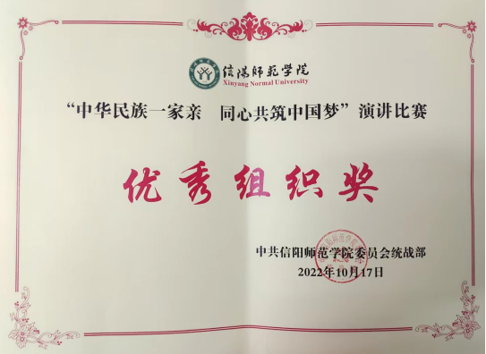 为深入学习宣传贯彻习近平新时代中国特色社会主义思想、习近平总书记关于加强和改进统一战线工作的重要思想,引导和调动全院师生在浓厚党史、统战史学习氛围中迎接和庆祝党的二十大胜利召开,awc777万象城娱乐官网党委认真组织学生积极参加“中华民族一家亲 同心共筑中国梦”演讲比赛,2022级文化产业管理班学生赵恒升获三等奖,学院获优秀组织奖。