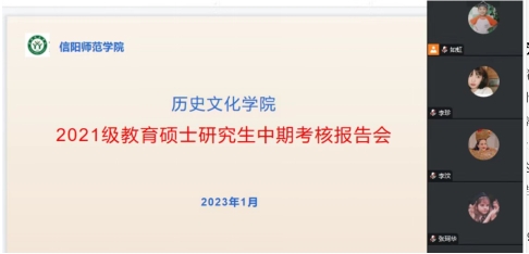 2023年1月7日,万象城官网以腾讯会议的形式举行了2021级教育硕士研究生中期考核报告会。会议由史经霞主持,叶宗宝、孙炜、李志坚、姚磊、张乐锋、连先用等导师参会,该专业全体在读研究生列会学习。