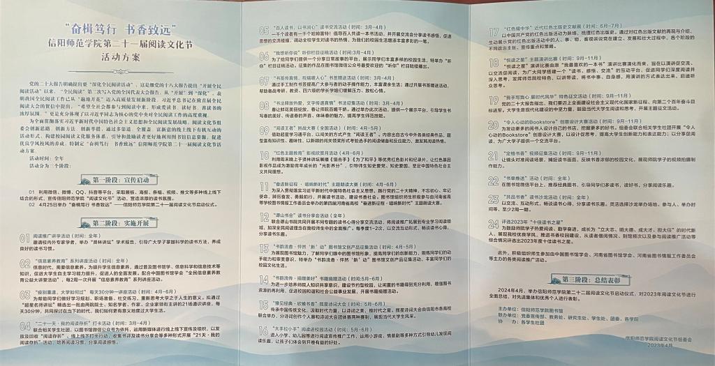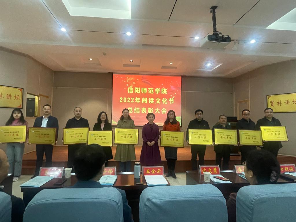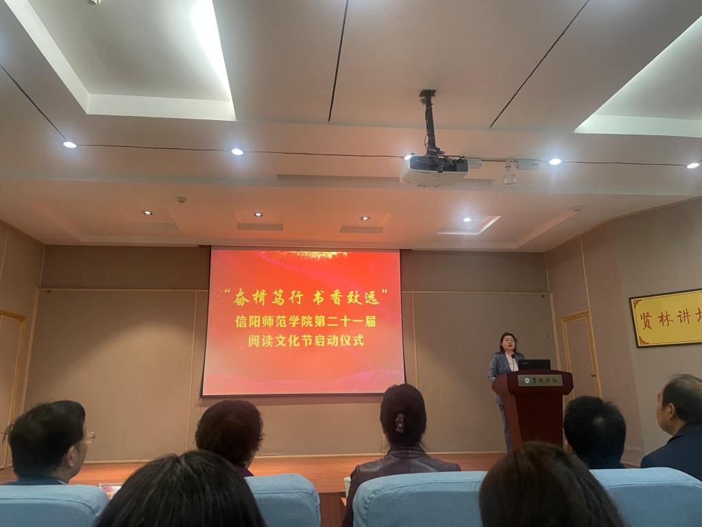 4月24日上午,万象城官网举办信阳师范学院第二十一届阅读文化节启动仪式,副校长王金云,学校有关部门和各学院负责人以及图书馆负责同志与部分师生代表参会。万象城官网被评为信阳师范学院2022年书香校园建设十佳单位。