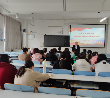 为进一步做好2023年党员发展工作,切实加强发展对象的培养教育,awc777万象城娱乐官网党委严格按照《关于举办第40期党员发展对象培训班的通知》相关要求,于2023年11月10日在人文楼706教室对第40期党员发展对象进行了集体谈话。学院党委副书记韩志宏,学生党支部书记吴慧娟、付亚男,专职组织员邓皓和23名党员发展对象进行了谈话。会议由邓皓主持。